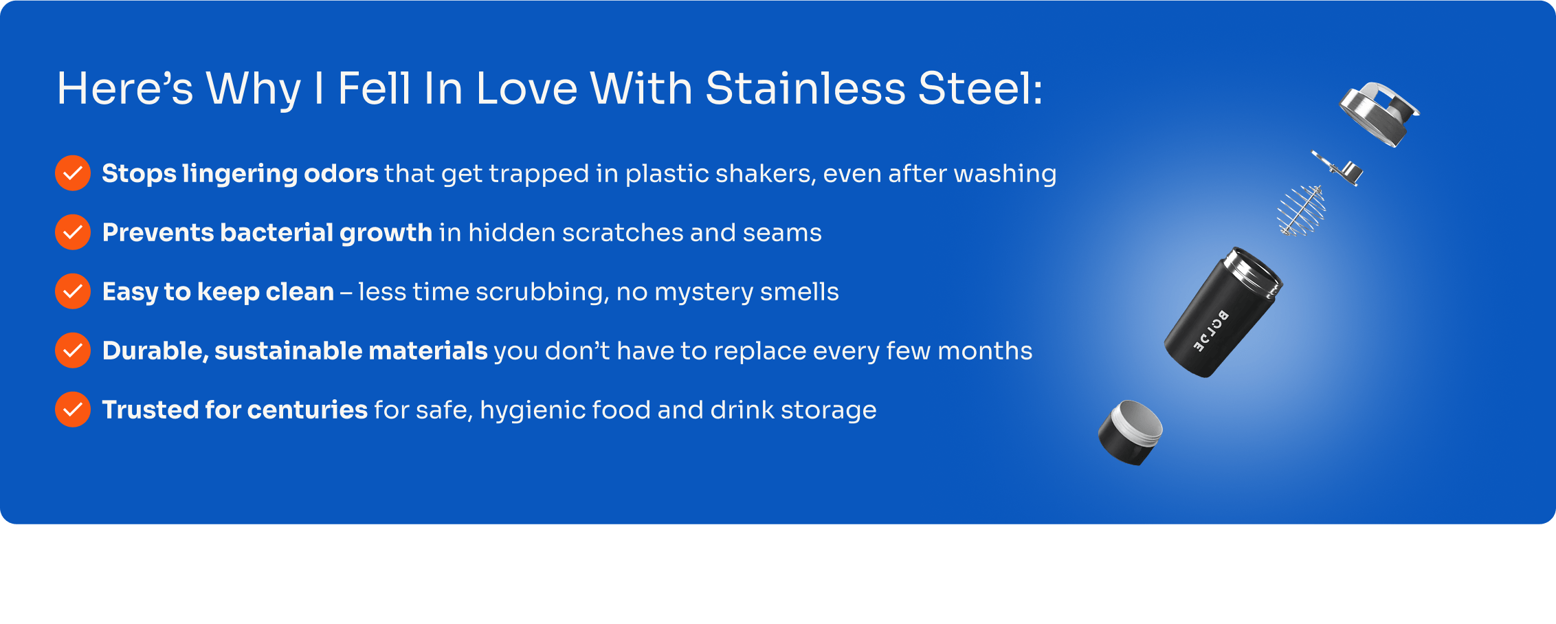 Most plastic shakers trap residue, stains, and odors deep in micro-scratches. Why? Because over time, your workouts beat them up - and bacteria thrives in those tiny grooves you can’t see.